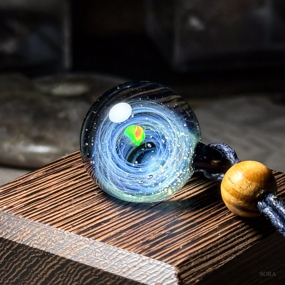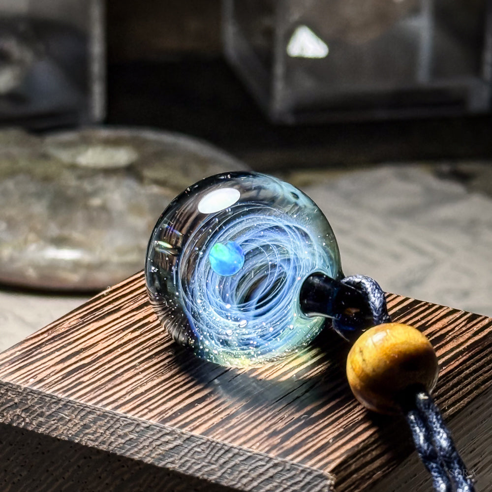 奥に煌めく幾万の星々を眺めるとき、現実とは違う幻想的な世界にあなたの心を連れて行ってくれる。そんなペンダントです。