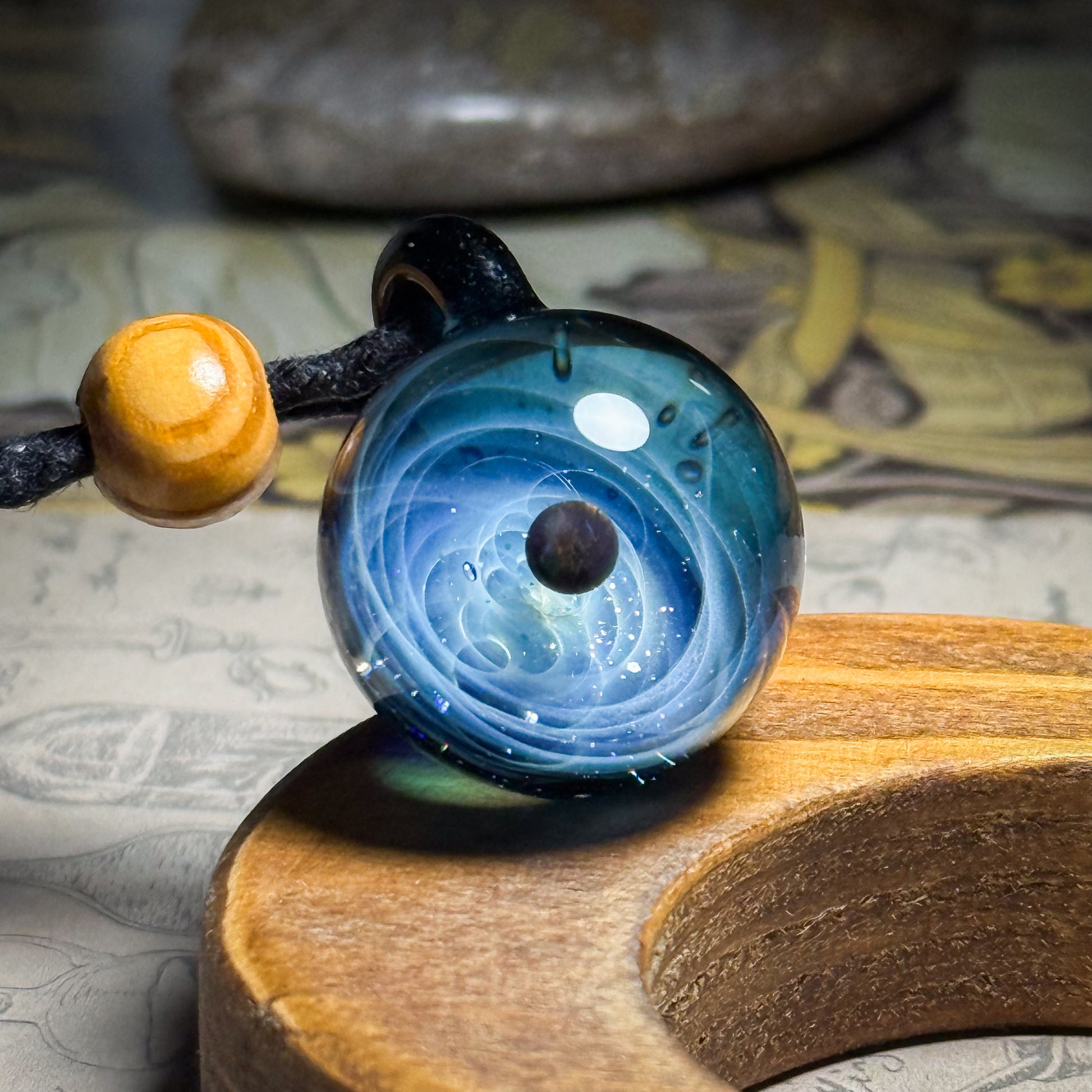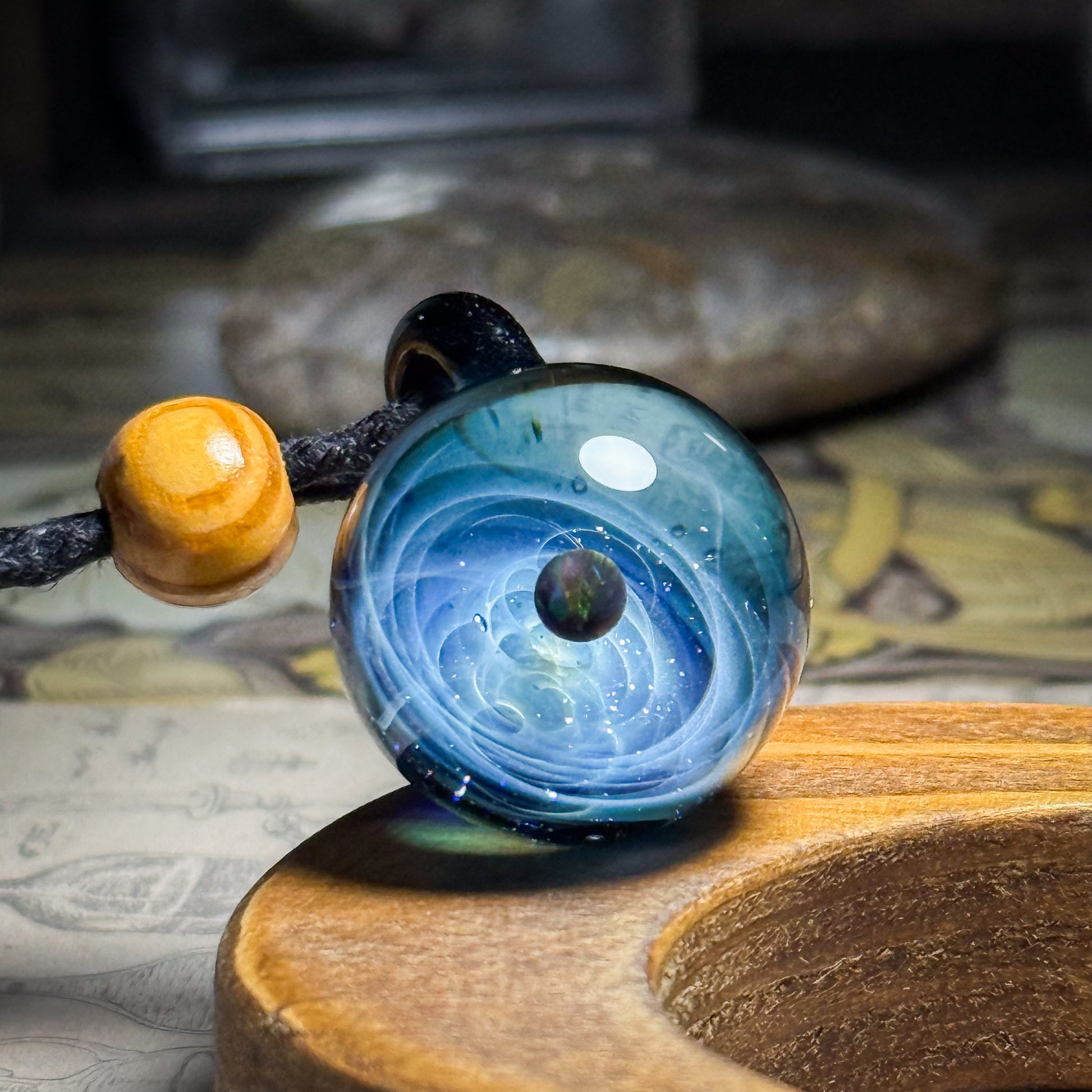 小さなガラスの中に純銀で描いた螺旋は、宇宙のエネルギーや惑星の軌道を連想させてくれるでしょう。 奥に煌めく幾万の星々を眺めるとき、現実とは違う幻想的な世界にあなたの心を連れて行ってくれる。そんなペンダントです。