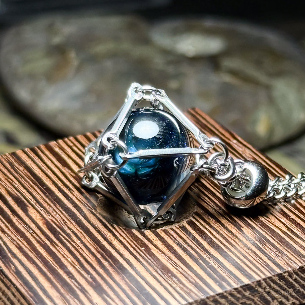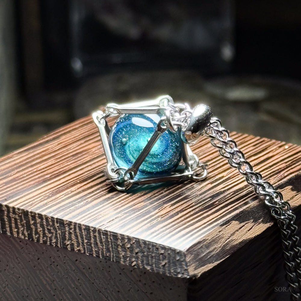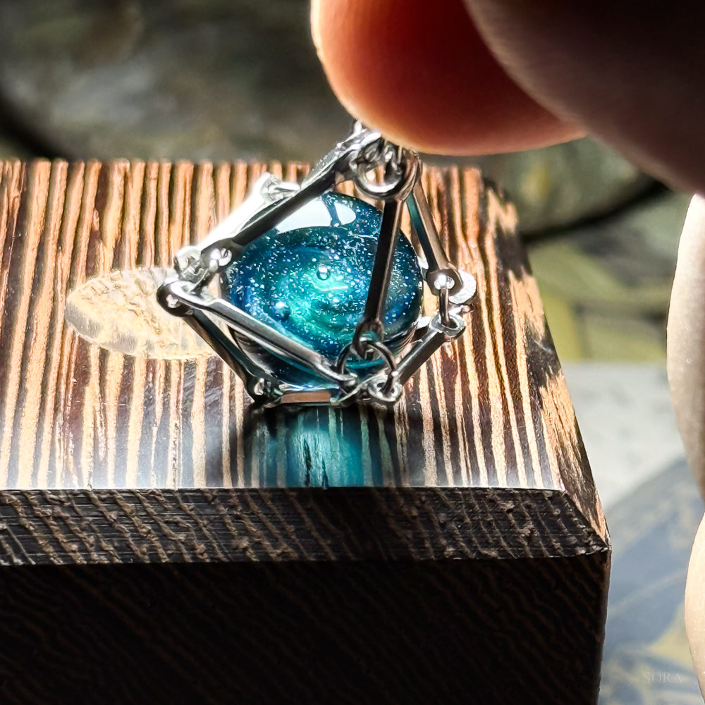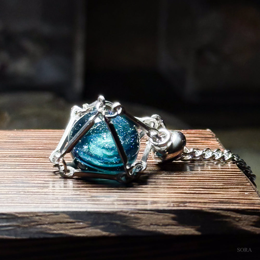 繊細な銀の籠に包まれたガラスの星は、夜空の深淵と、遥かなる銀河の記憶を映し出します。