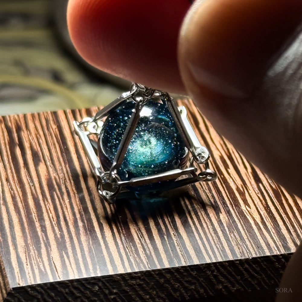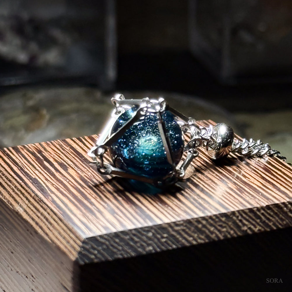 繊細な銀の籠に包まれたガラスの星は、夜空の深淵と、遥かなる銀河の記憶を映し出します。