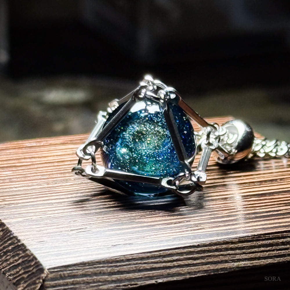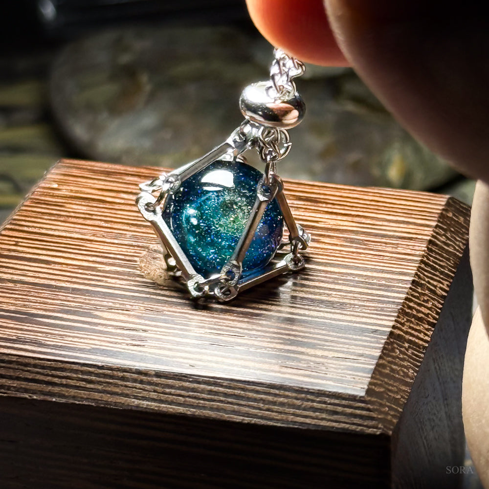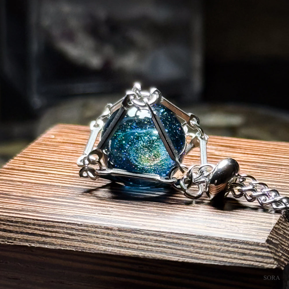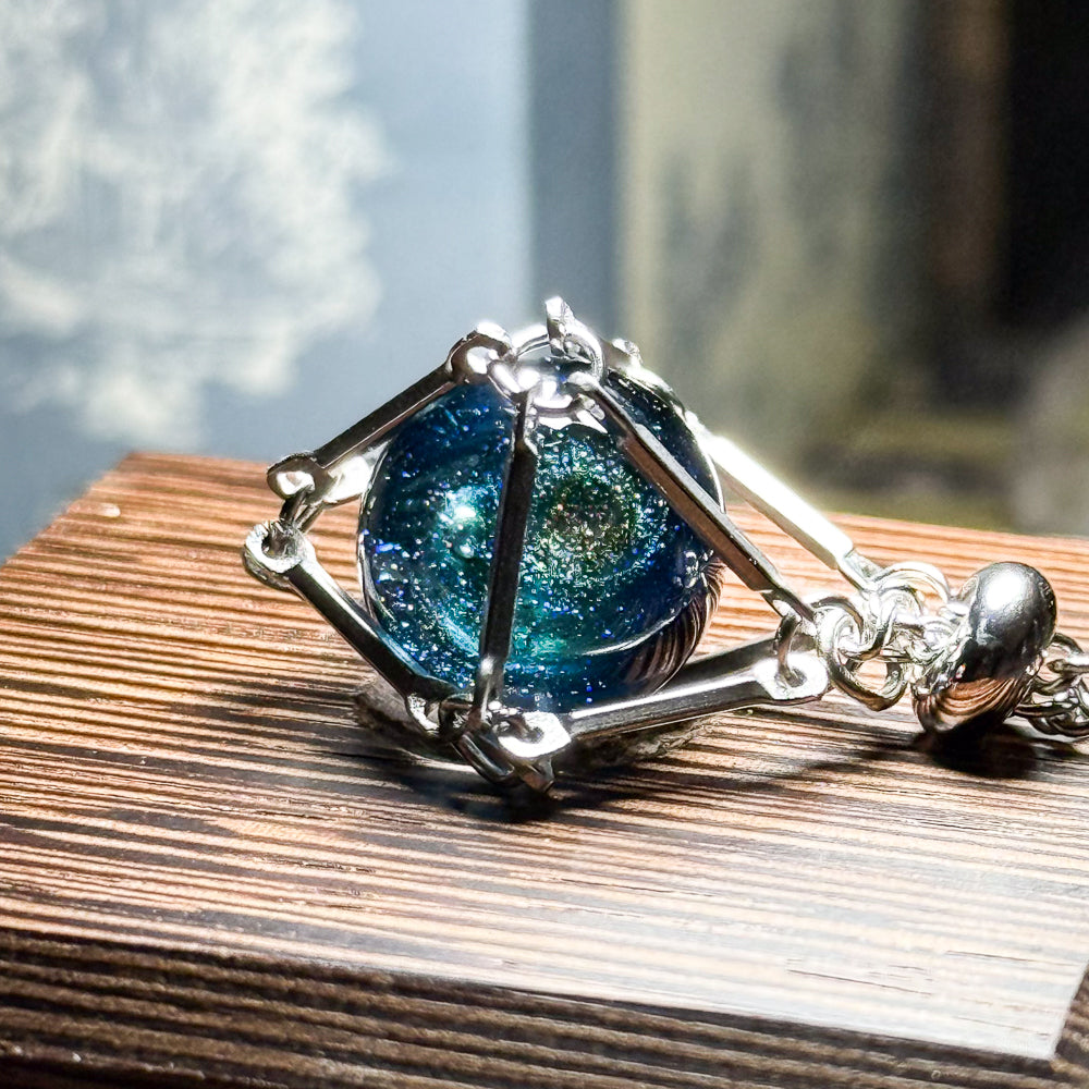 繊細な銀の籠に包まれたガラスの星は、夜空の深淵と、遥かなる銀河の記憶を映し出します。