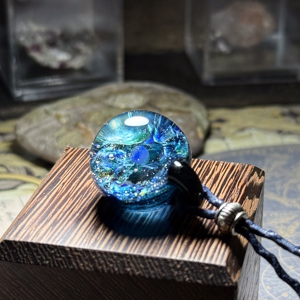 きらきらの銀河ペンダントはその名の通り、ガラスの中の宇宙を象徴する銀河のきらめきとオパールの惑星をとじこめた作品です。