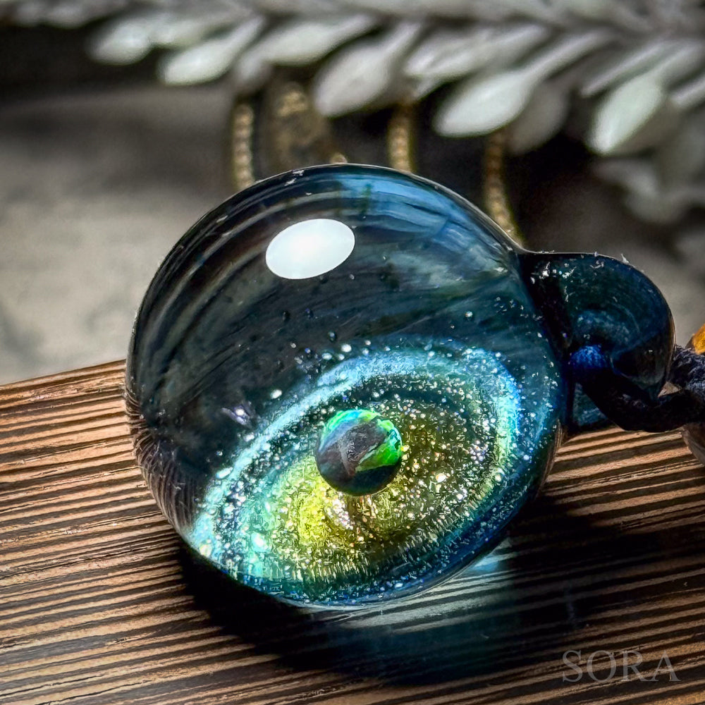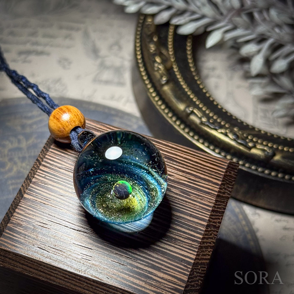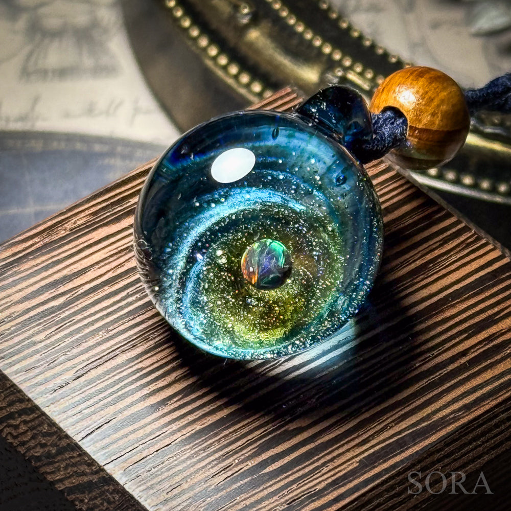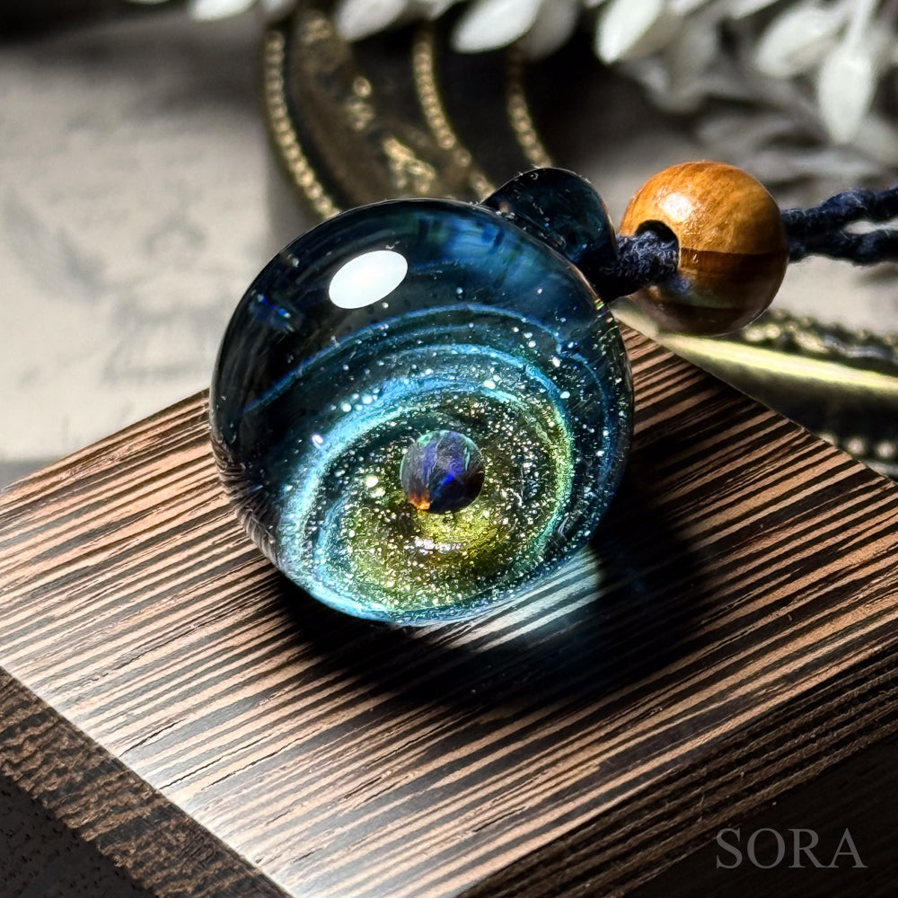 きらきらの銀河ペンダントはその名の通り、ガラスの中の宇宙を象徴する銀河のきらめきとオパールの惑星をとじこめた作品です。