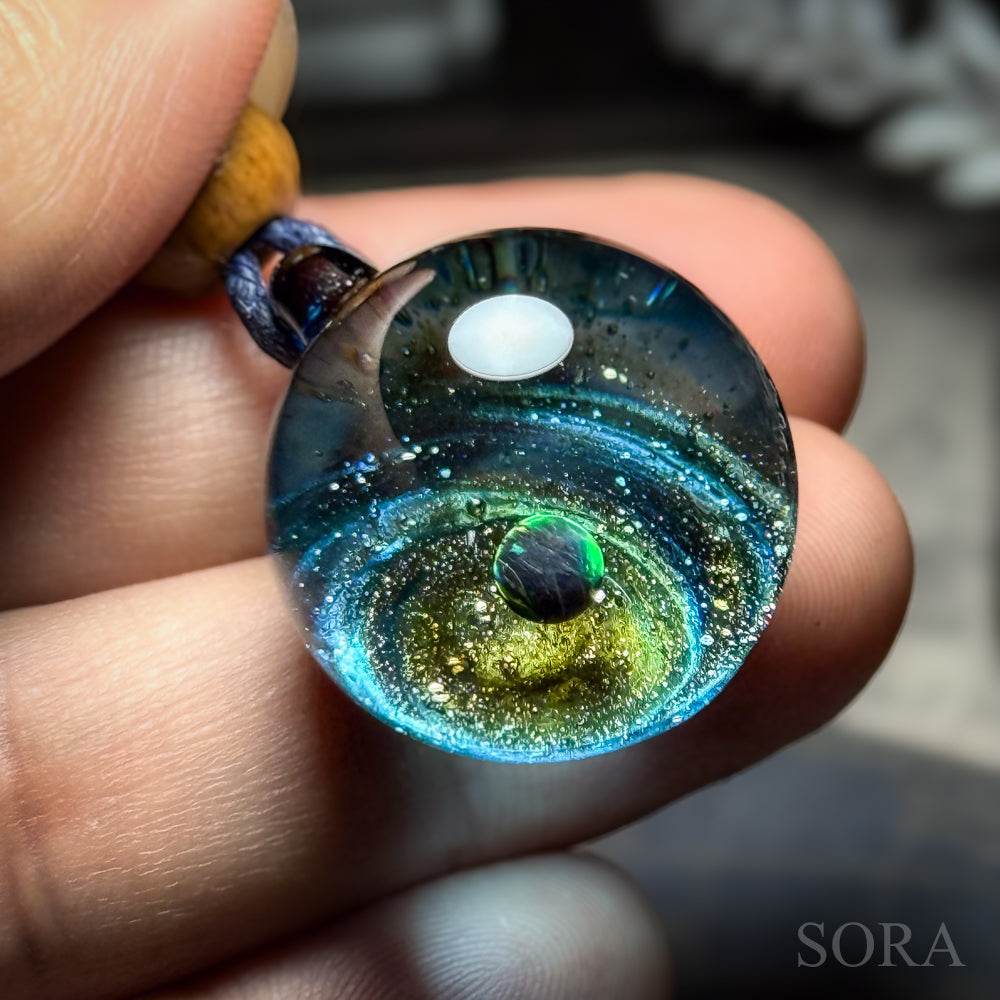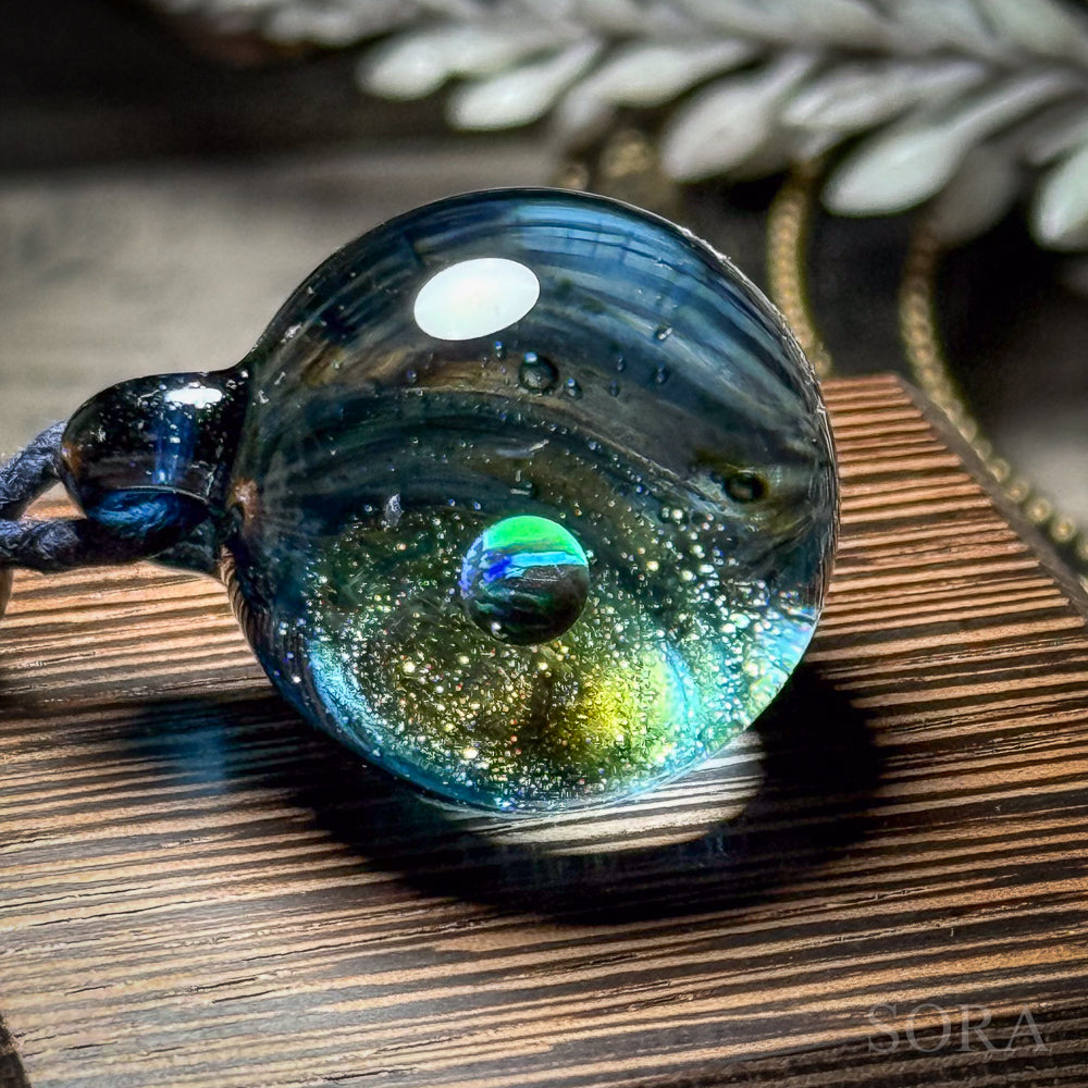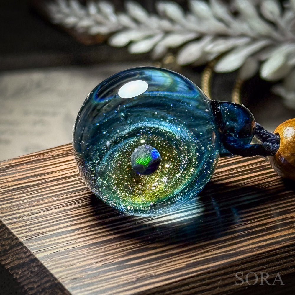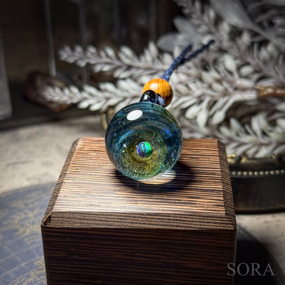 きらきらの銀河ペンダントはその名の通り、ガラスの中の宇宙を象徴する銀河のきらめきとオパールの惑星をとじこめた作品です。