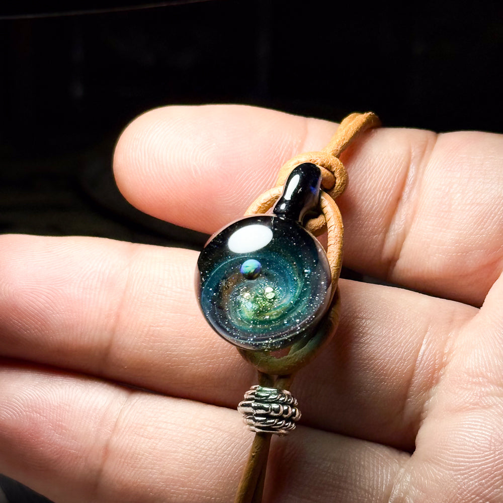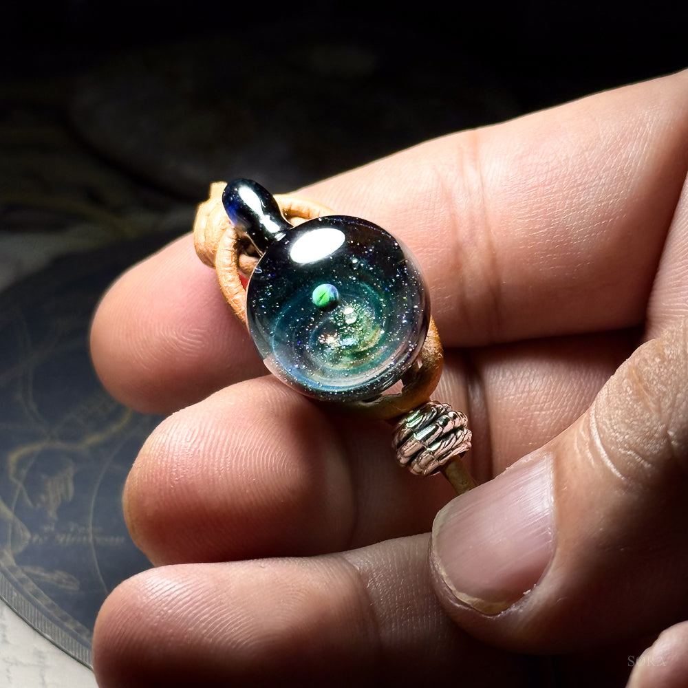 きらきらの銀河ペンダントはその名の通り、ガラスの中の宇宙を象徴する銀河のきらめきとオパールの惑星をとじこめた作品です。